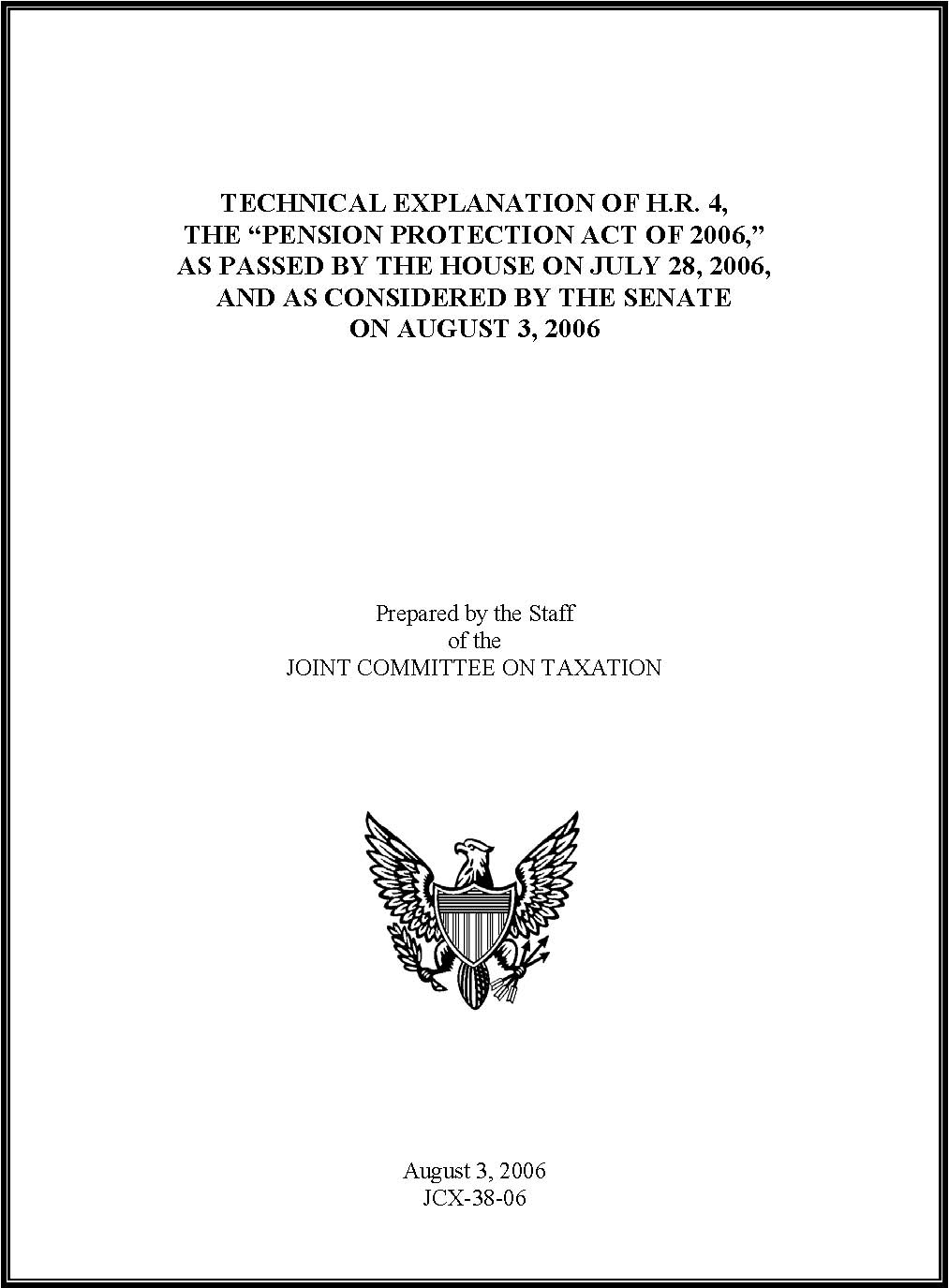 This document may be cited as follows: Joint Committee on Taxation, Technical Explanation of H.R. 4, the “Pension Protection Act of 2006,” as Passed by the House on July 28, 2006, and as Considered by the Senate on August 3, 2006 (JCX-38-06), August 3, 2006.