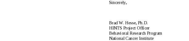 Few things in life are as important as health. I am writing to encourage your household’s participation in an important national survey sponsored by the National Cancer Institute (NCI), part of the National Institutes of Health. The survey, known as the Health Information National Trends Survey, is authorized under 42 USC, Section 411.285a. The survey concerns what people know, believe and do about certain aspects of their health. The results of the study will help NCI’s ongoing effort to promote good health and prevent disease.