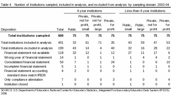 As stated above, the exclusion of 199 institutions (33 percent of the sample) created a nonresponse problem and introduced potential nonresponse bias. During the development of the study, it was expected that analysts would be able to obtain all financial statements for sampled institutions, but the eZ-Audit and Federal Audit Clearinghouse were not as exhaustive as expected. Analysts were able to obtain copies of the relevant financial statements directly from institutions, although not for all sampled institutions. Table 4 shows the final disposition of the sampled institutions across sampling stratum.