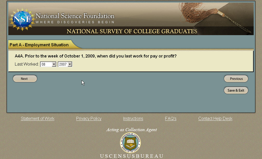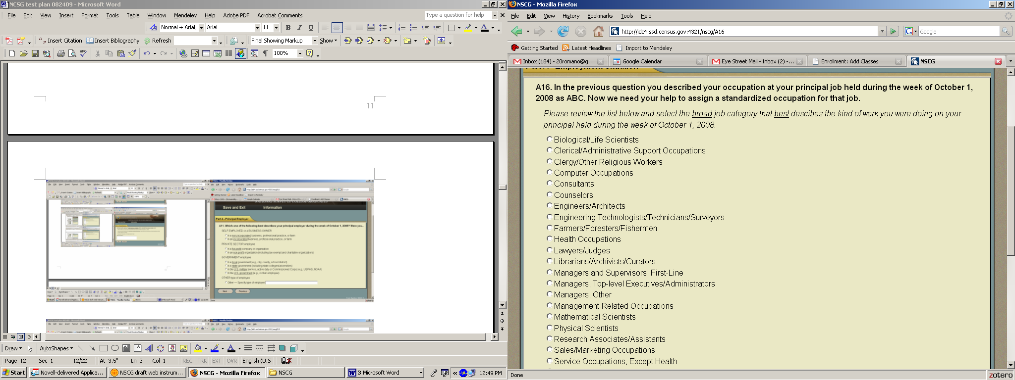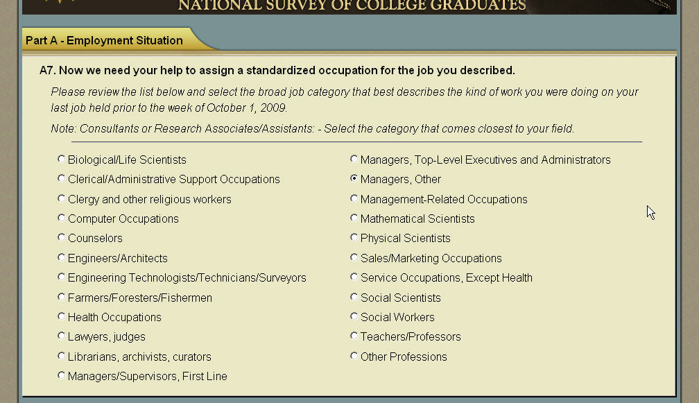 At this time we are conducting a second round of interviews, involving an additional 30 participants during February and March, 2010. These interviews will be conducted with two new versions of the questionnaire. While the initial versions included the placement of the job categories in two columns and tested the sequence of the ‘Next’ and ‘Previous’ buttons, the new versions include a single column of job categories. This will result in the following four versions of the form: