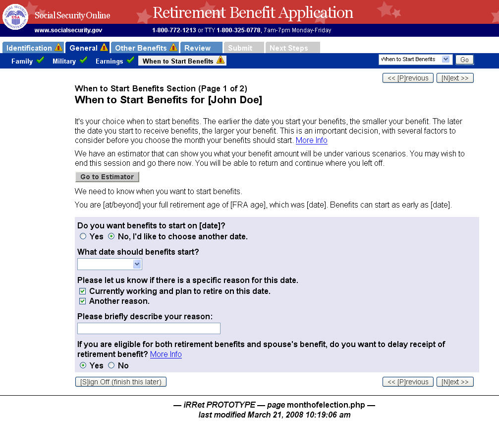 1.6restart page (will be shown to users accessing the retirement estimator from the when to start benefits page and then returing to the application and to users who select “continue application” on the welcome page)
