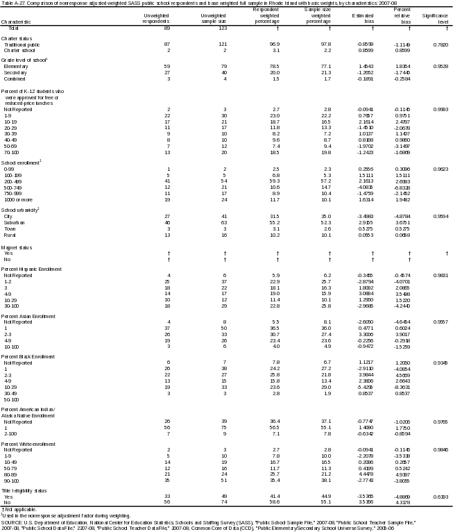 The first two columns of data show the unweighted count of schools or teachers in the relevant characteristic category for respondents and nonrespondents (for base-weighted tables) or the eligible sample population (for nonresponse-adjusted or final-weighted tables), respectively. These two columns show the unweighted response and nonrespondent or sample numbers for each characteristic category. These columns show the cell size for each category.