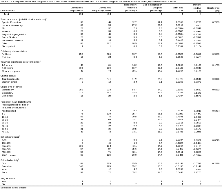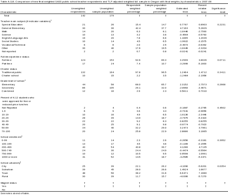 Similar comparisons are made using the final weight to evaluate the effect of the teacher nonresponse adjustment factors. However, instead of comparing respondents and nonrespondents, shared characteristics of respondents are compared to the original sample to estimate the effect of weighting. Schools and teachers that were deemed to be out-of-scope after data collection began were excluded from this analysis. Therefore, the original sample populations were slightly larger than those used for this analysis.