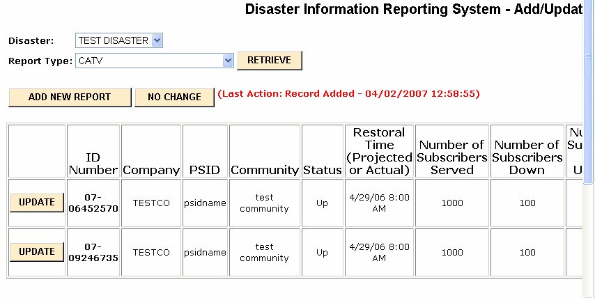 If you select Display/Update Reports, you will be sent to the following screen so that you can file, update or view your disaster reports: