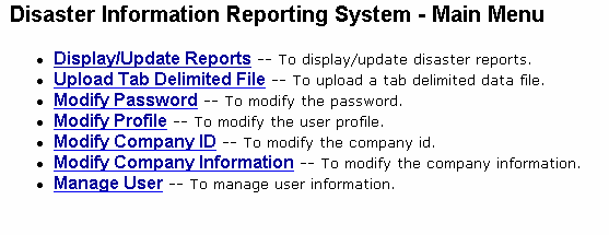 The “Modify Company ID”, “Modify Company Information”, and “Manage User” selections on the menu are available only to report coordinators. The other items are available to both inputters and coordinators.