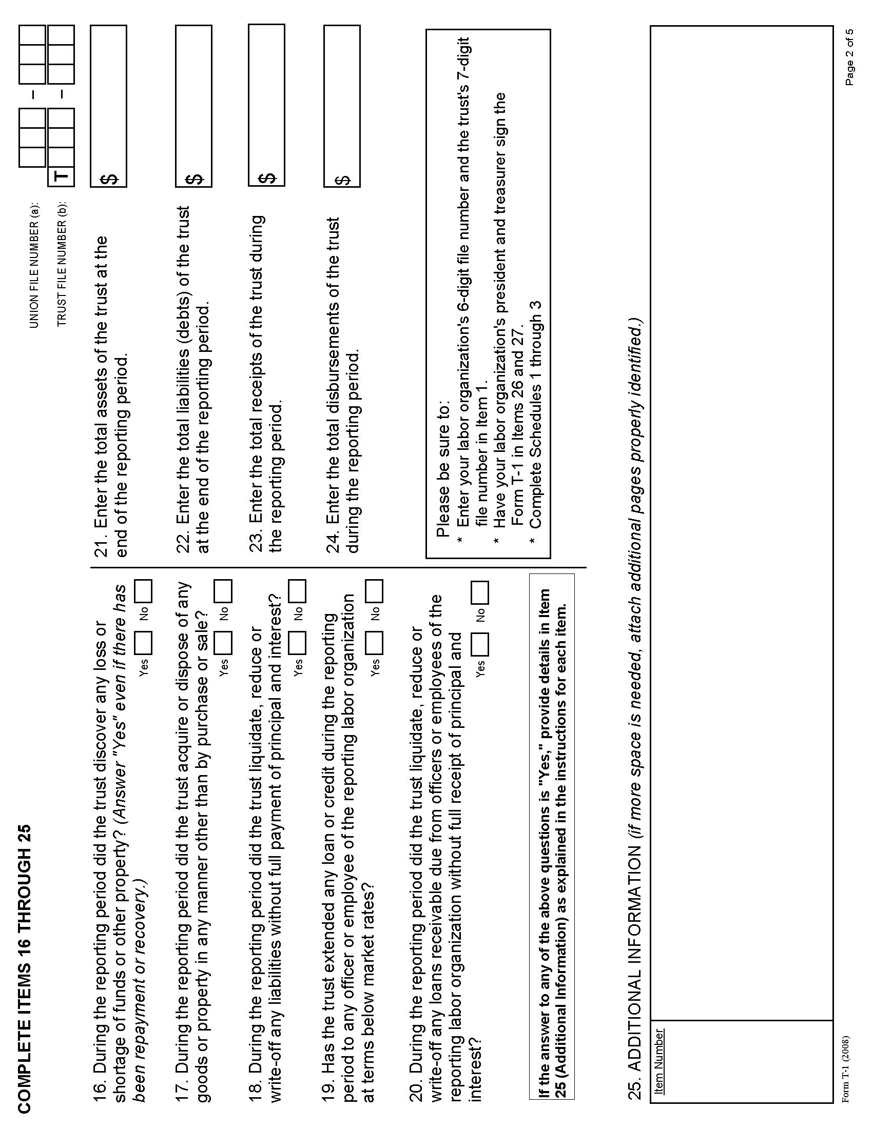 Answer “Yes” to Item 15 if the labor organization will be submitting an independent, certified audit in place of the remainder of Form T-1. If an audit report meeting the standards described in Section I (Who Must File) is submitted with a Form T-1 that has been completed for Items 1 through 15 then it is not necessary to complete Items 16 through 25, and Schedules 1 through 3. However, Items 26-27 (Signatures) must be completed.
