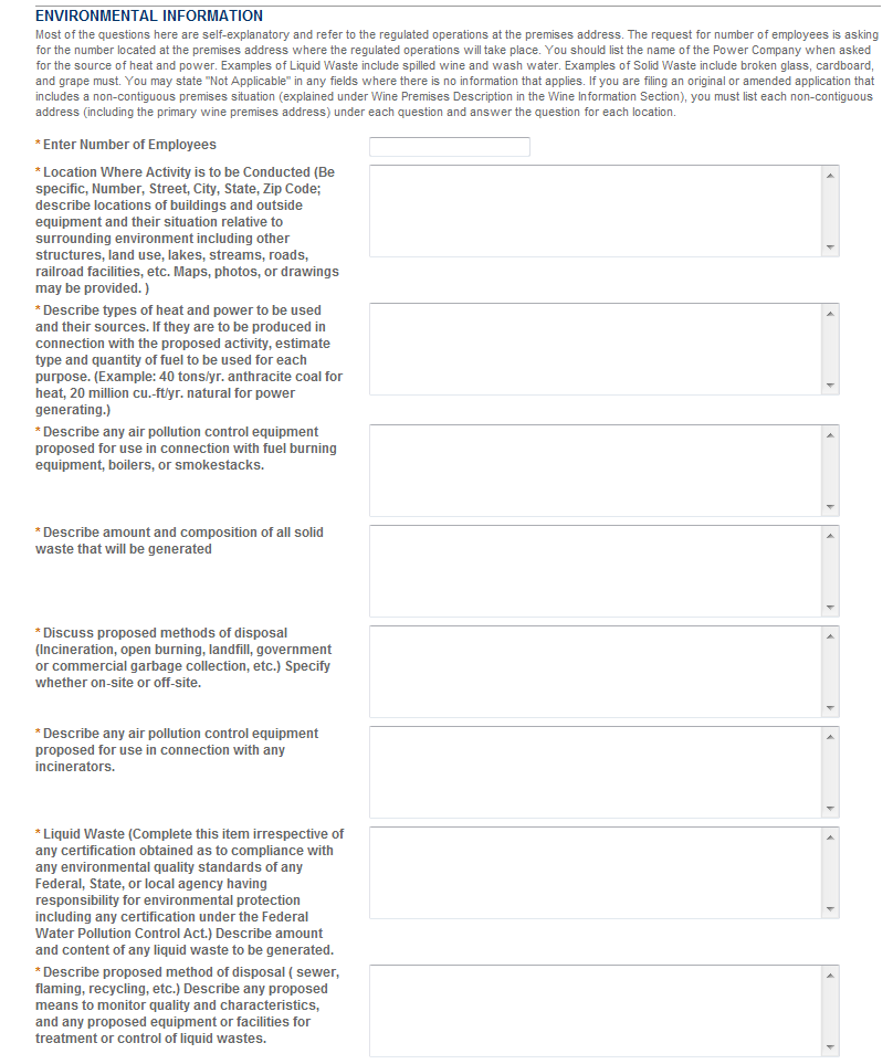 The following screens depict what a typical industry member would need to fill out for completing the New Winery application which is a collection of the following OMB forms: