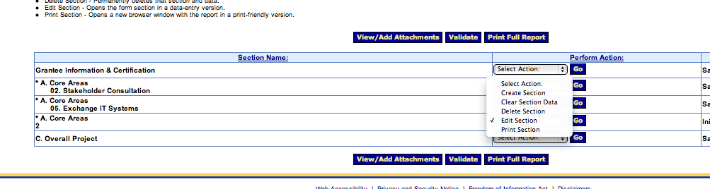 Screen 3 (Detail) – Grantees can add and edit sections, and only report on funded activities.