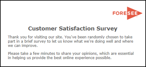 | Thank you for visiting SSA.gov. You have been randomly selected to take part in this survey that is being conducted by ForeSee on behalf of the Social Security Administration. Please take a few minutes to give us your feedback. All results are strictly confidential. | Thank you for taking our survey - and for helping us serve you better. Please note you will not receive a response from us based on your survey comments. If you would like us to contact you about your feedback, please visit the Contact Us section of our web site. |