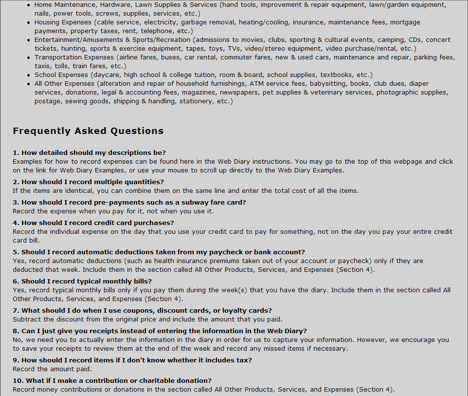 As we also suggested after Round 1, we suggest providing a video clip of a demonstration of someone entering expenses into the CE Web Diary because talking about hypothetical Web screens does not work as well as a real visual example where the R can see the actual screen and someone really using it. Furthermore, this will increase the consistency of the delivery of the directions, leading to more consistent results.