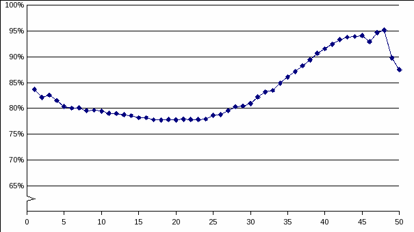 Examining calling efficiency in a different way, we can see in Figure 3 that the percentage of call attempts that end in a noncontact increases dramatically after 30 attempts. Prior to 30 call attempts the probability is between 75 and 80%, but after 45 attempts 95 percent of the calls placed to sample units result in a noncontact.