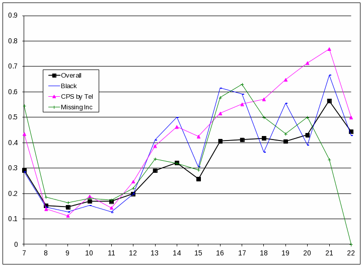 Time of Day: The time of day of the ATUS calling appeared to be related to the probability of completion for those that conducted a CPS interview by telephone and those that did not provide valid income data for the CPS. Specifically, CPS telephone interview completions were more likely than their counterparts to complete their interviews in the evening until quite late (9pm - 10pm). By contrast income incompletes were most likely to complete interviews between three and six o’clock, with the probability of completion being quite low in the late evenings. Finally, sample units with a black reference person are more likely to be contacted and complete an interview in the afternoon. Figure 6 in Appendix D shows the proportion of attempts that result in a completed interview by time of day for all sample units, sample units that failed to provide income data on the CPS, sample units with a black reference person, and sample units that completed a CPS telephone interview. Figure 7 shows the proportion of attempts that result in a contact by time of day for sampling units with the same characteristics.