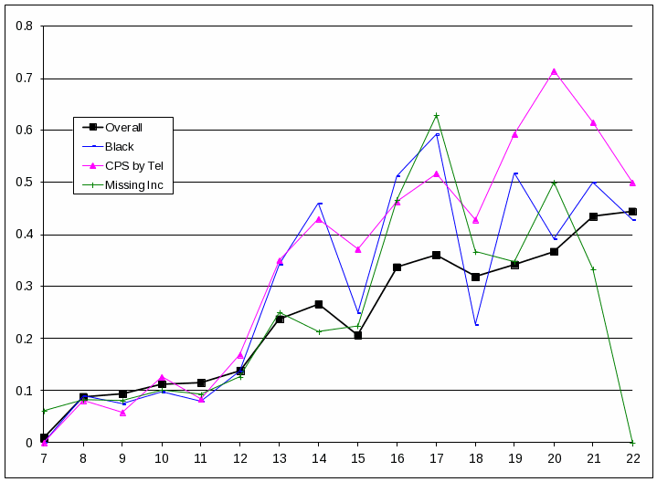 In addition to examining plots, these data are analyzed using proportional hazard models.2 The “hazard” of a successful outcome is regressed on a long list of covariates that include: demographic variables, telephone usage and some survey operation information from the CPS, as well as call history information from the ATUS. Appendix A describes the key variables used in these models. The results of the “best3” proportional hazard model are verified using stepwise logistic regression.