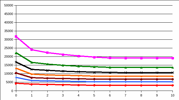 Figure 4 shows the number of sample units cleared by completion by days in the field. We can easily see the general shape of the survival curve including a plateau or relatively flat part of the curve after five attempts. We can also plot the cases cleared by completion within each day the sample unit is fielded. Figure 5 shows the cases cleared by first, or initial, contact by attempt, where each line indicates a successive day in the field. The top line is the first day in the field where up to 10 attempts are shown within that day, the second line from the top is the second day in the field, showing a less steep curve over the initial five attempts. This line continues to become less steep s the number of days in the field progresses (eight days are shown), so that the eighth day of calling is quite flat.