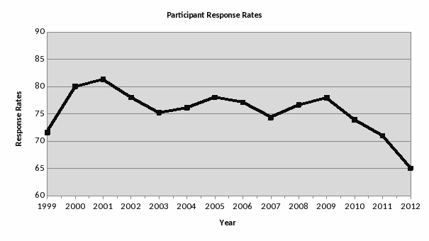 The hourly wage rate of $21.74 per person is based on income from wages and salary from the Bureau of Labor Statistics: http://www.bls.gov/oes/current/oes_nat.htm#00-0000. This wage rate for all persons was used since respondents do not fall into a single economic or occupational category. The total cost was $1,064,956 or $54.86 per respondent. (NOTE: There are no out-of-pocket costs to survey participants. Participants are remunerated for their time as well as for child care and transportation expenses.)