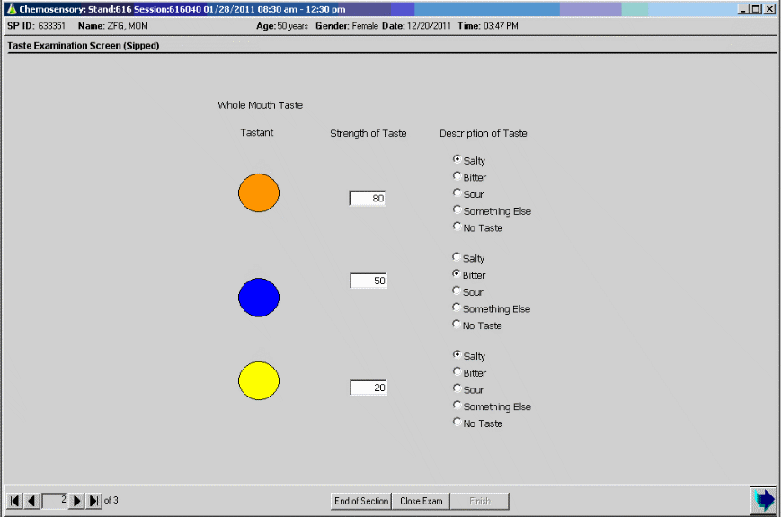 TASTE EXAMINATION DATA ENTRY SCREEN: WHOLE MOUTH TASTE TESTING