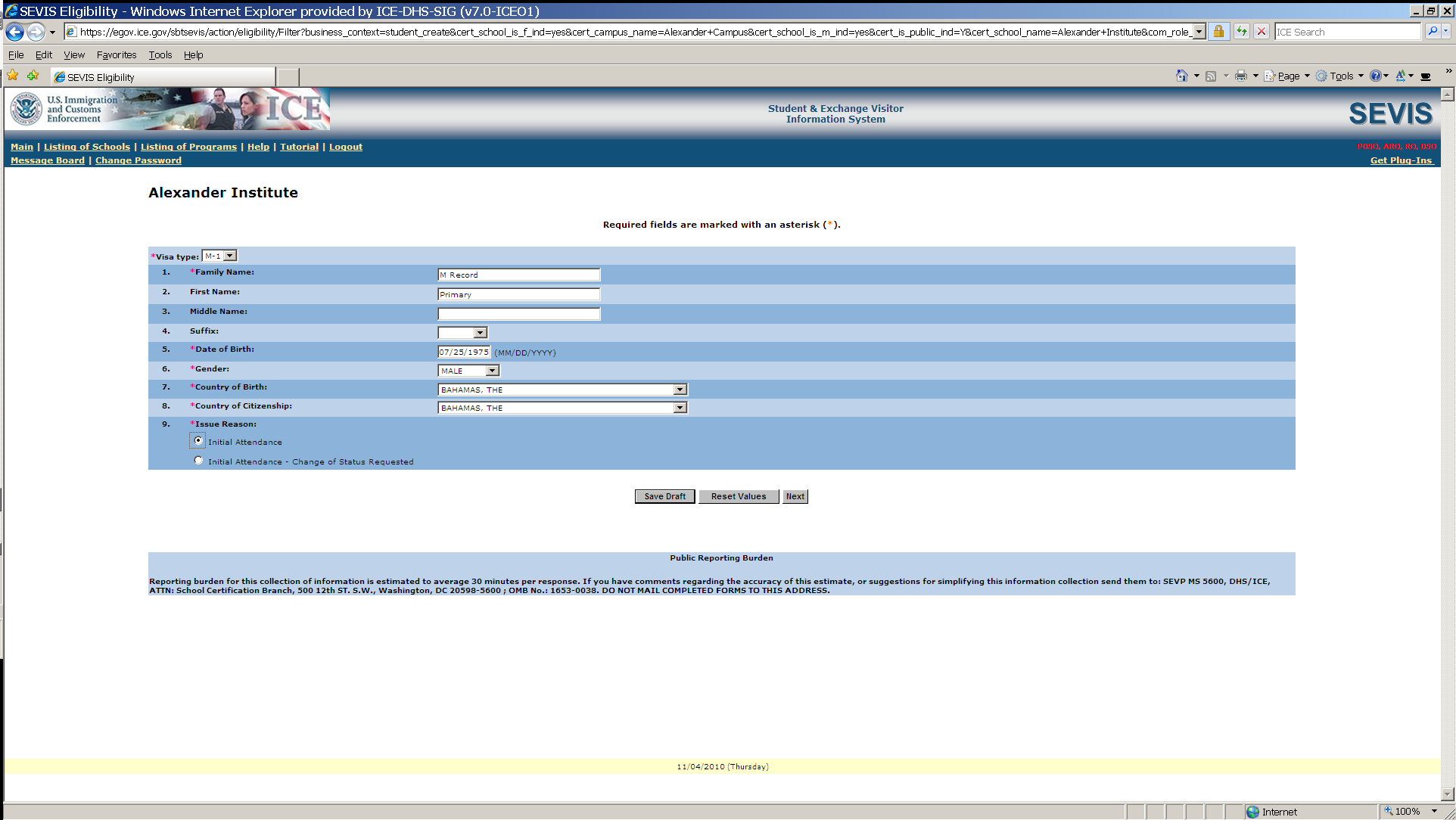 Steps above produce this M-1 Student SEVIS Record in Initial status.