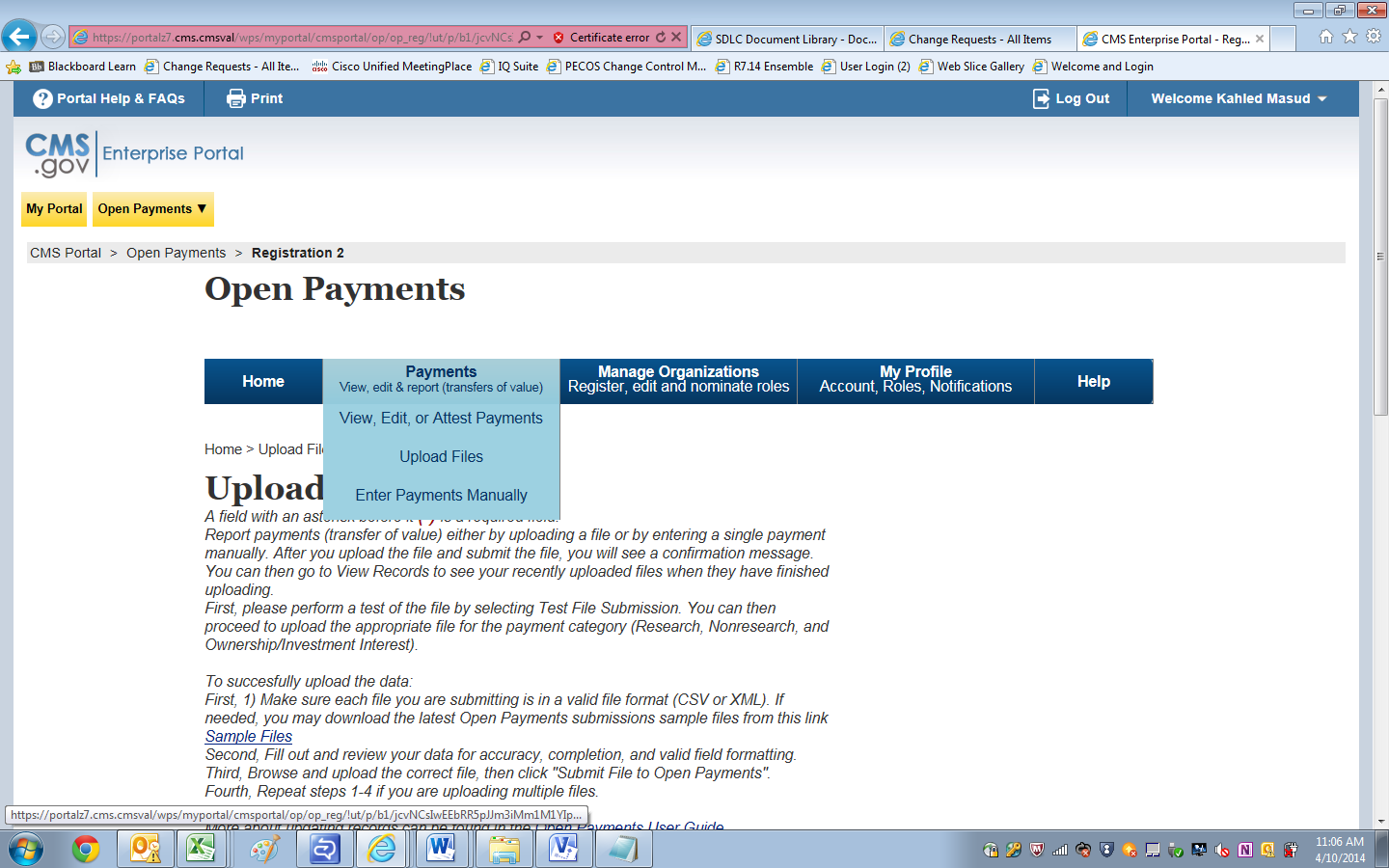 The screen shots below illustrate the workflow (submission + Attestation) of a user uploading a file containing general payments records.