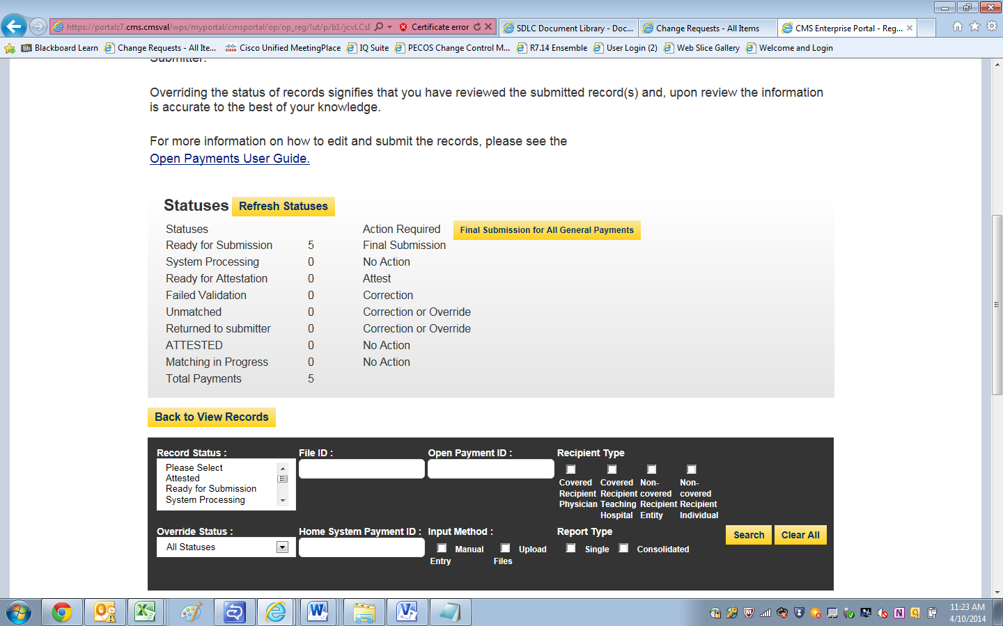 The screen shots below illustrate the workflow (submission + Attestation) of a user uploading a file containing general payments records.