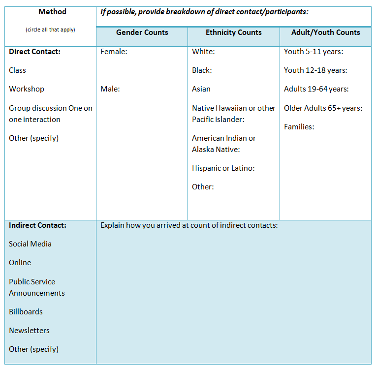 Conduct a process evaluation and track program inputs and outputs by providing this form to staff or volunteers to complete for each activity. You can adapt this form to suit your program’s needs. When collected input responses into a spreadsheet to keep track of program activities. Don’t forget to reflect on the information gathered to see how activities can be improved.