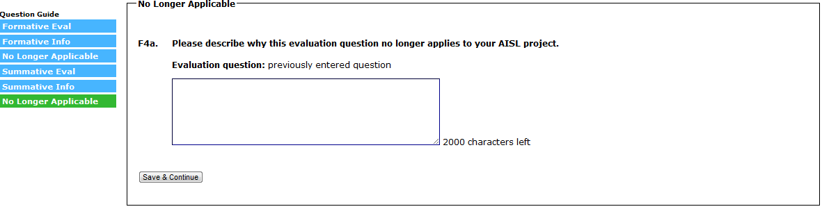 (FOR EACH EVALUATION QUESTION MARKED “NO LONGER APPLICABLE” IN F4, ANSWER F4A)