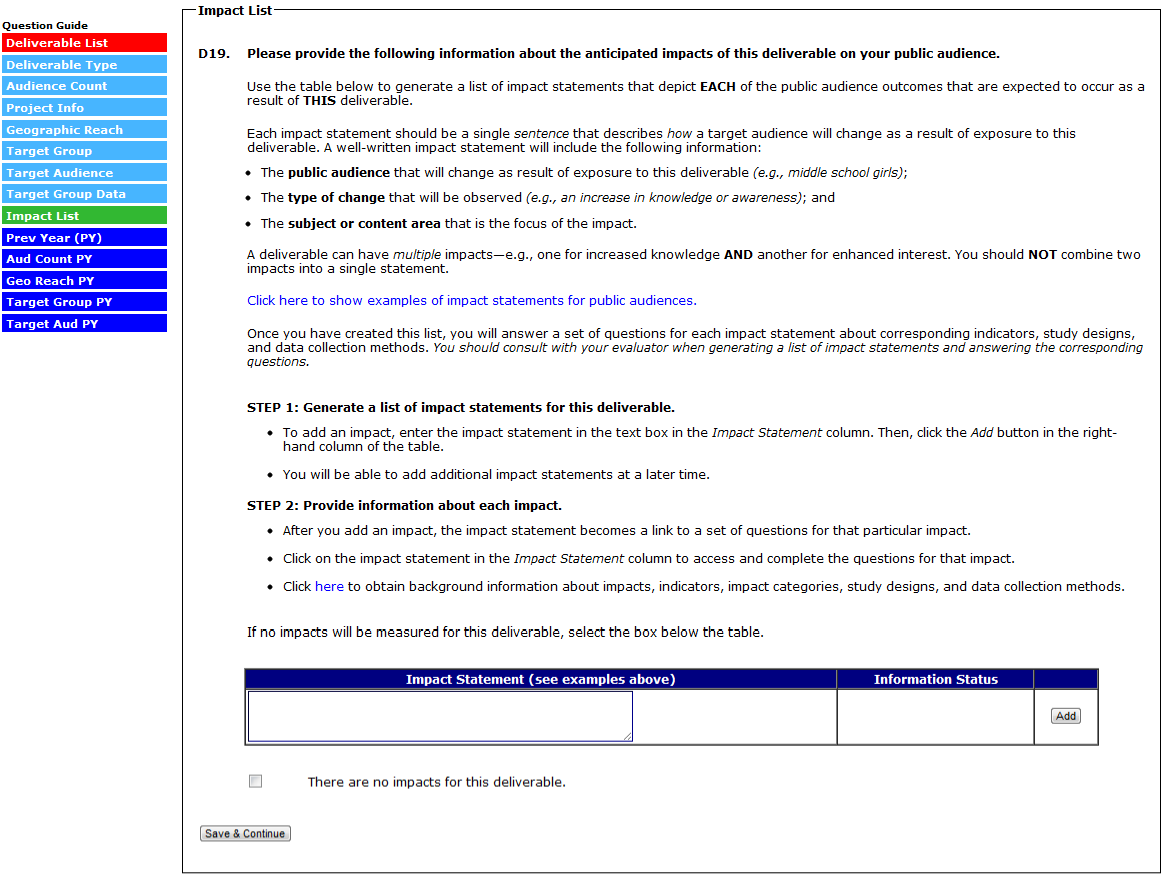 (SELECTING “THERE ARE NO IMPACTS FOR THIS DELIVERABLE” (OPTION AVAILABLE ONLY FOR DELIVERABLES MARKED “SECONDARY FOCUS” IN D13) WILL SKIP TO D20. FOR EACH IMPACT STATEMENT ENTERED INTO THE TABLE, ANSWER D19A-D19D)