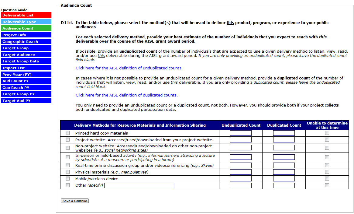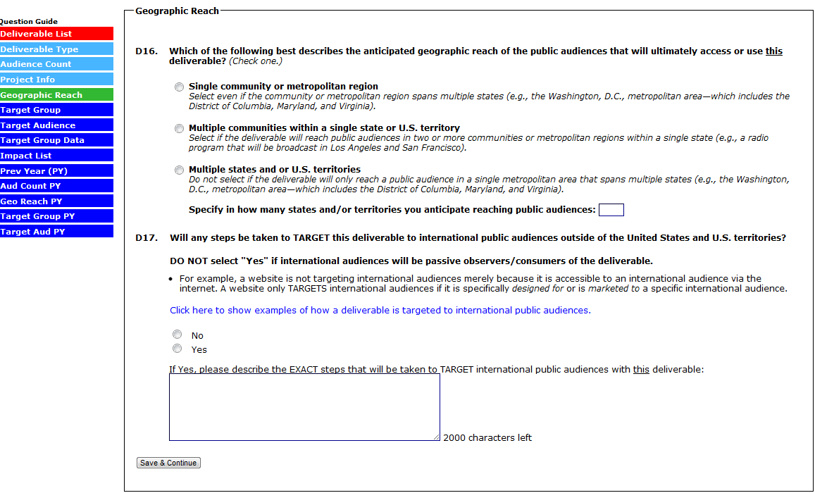 (SELECTING A DELIVERABLE IN THE “NEW DELIVERABLE” TABLE WILL BRING YOU TO D10-D24B. D10-D19D ARE QUESTIONS ABOUT WHAT THE DELIVERABLE WILL ACCOMPLISH OVER THE COURSE OF THE GRANT. D20-D24B ARE QUESTIONS ABOUT WHAT THE DELIVERABLE ACCOMPLISHED IN THE PAST CALENDAR YEAR, OR JANUARY 1 – DECEMBER 31 OF THE PREVIOUS YEAR.)