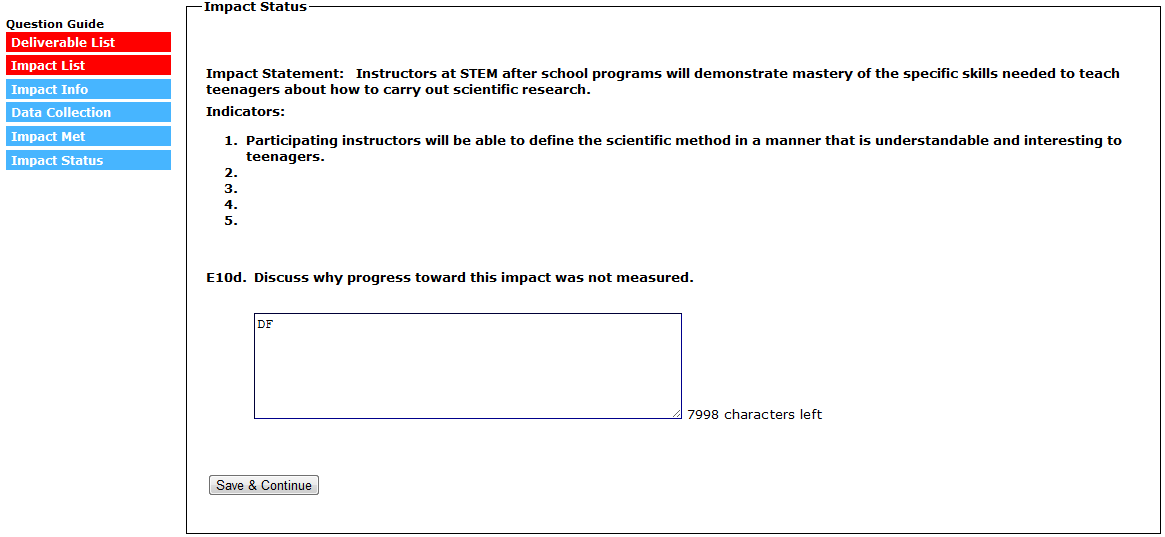 (SELECTING “SAVE & CONTINUE” RETURNS YOU TO THE IMPACT LIST)
