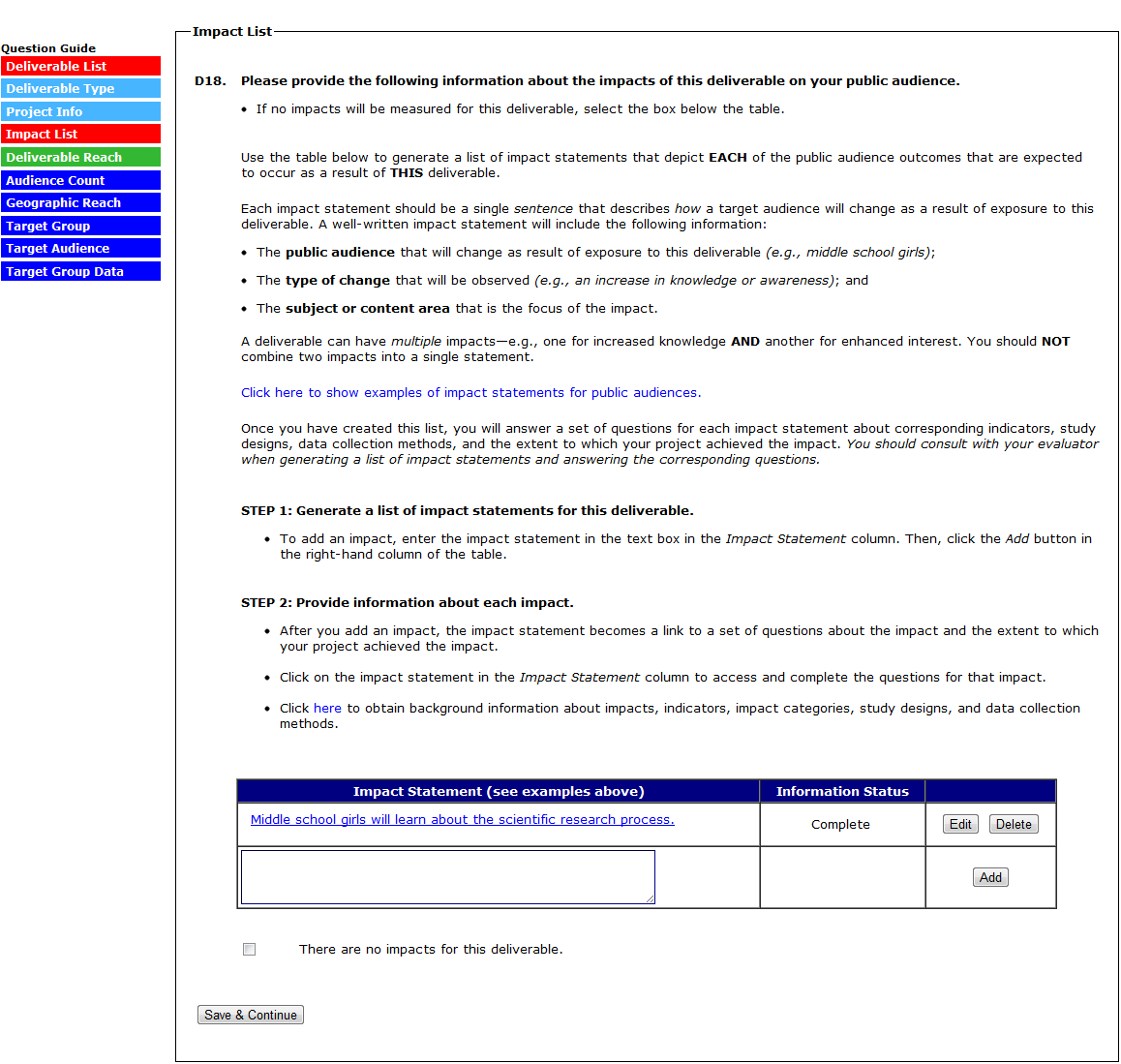 (SELECTING “THERE ARE NO IMPACTS FOR THIS DELIVERABLE” (OPTION AVAILABLE ONLY FOR DELIVERABLES MARKED “SECONDARY FOCUS” IN D15) WILL SKIP TO D20. FOR EACH IMPACT STATEMENT ENTERED INTO THE TABLE, ANSWER D18A TO D19A-E)