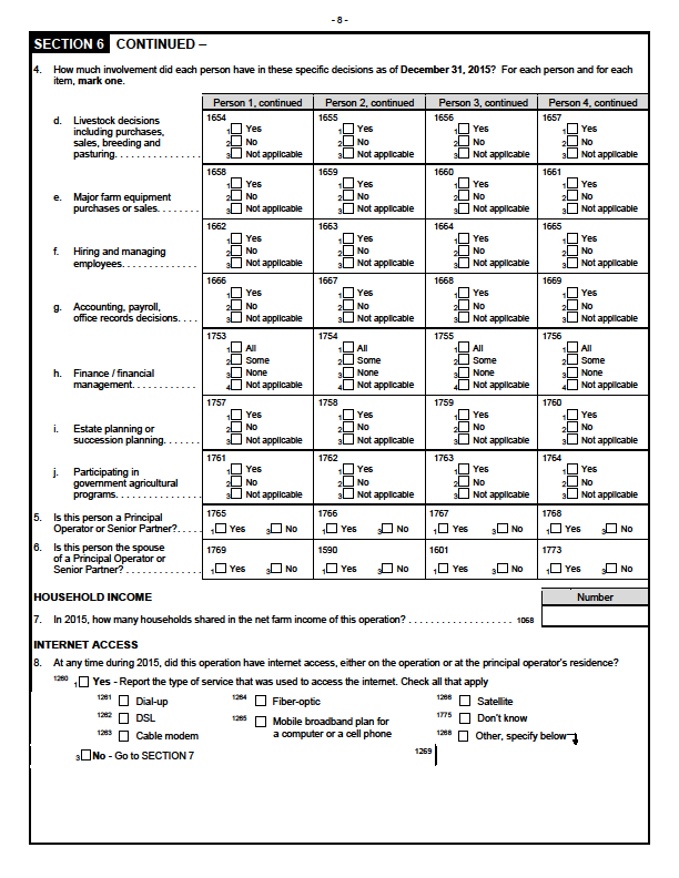 The charge to the Expert Panel was first to consider information currently published by NASS in light of the diversity in the organizational structure of contemporary farms and then to provide guidance on how to improve reporting for women and new/beginning farmers beginning with the 2017 Census of Agriculture. This information appears in Section 6 of the Agriculture Census questionnaire.