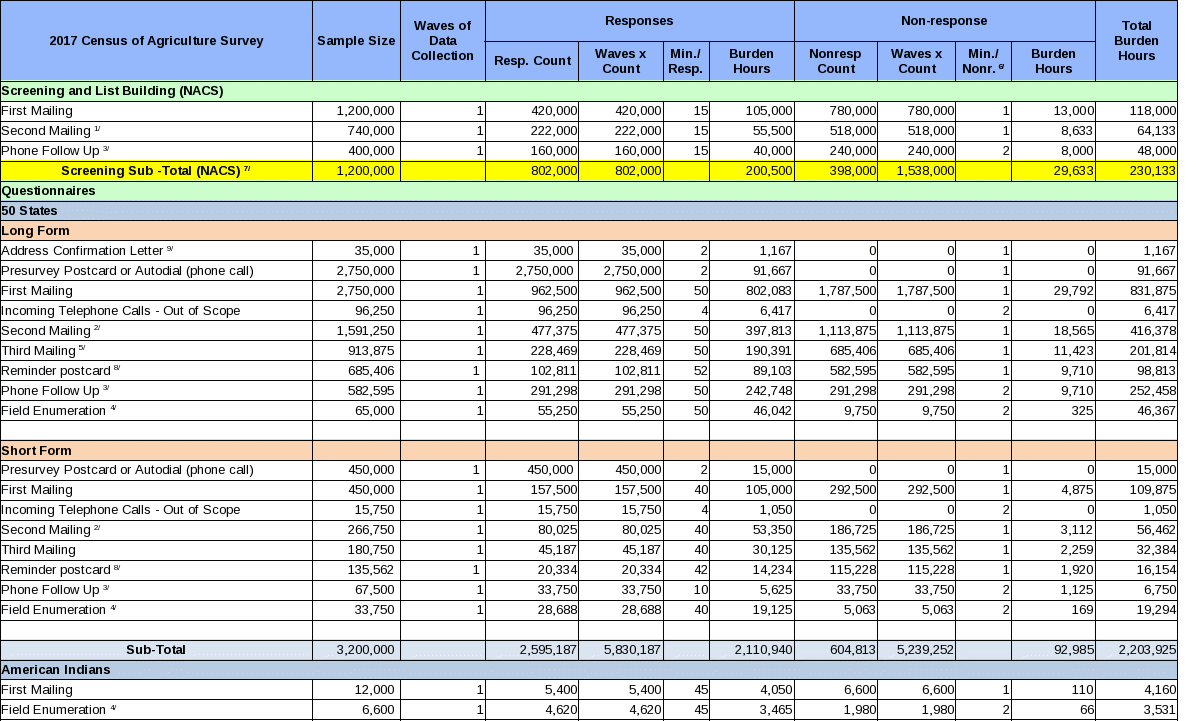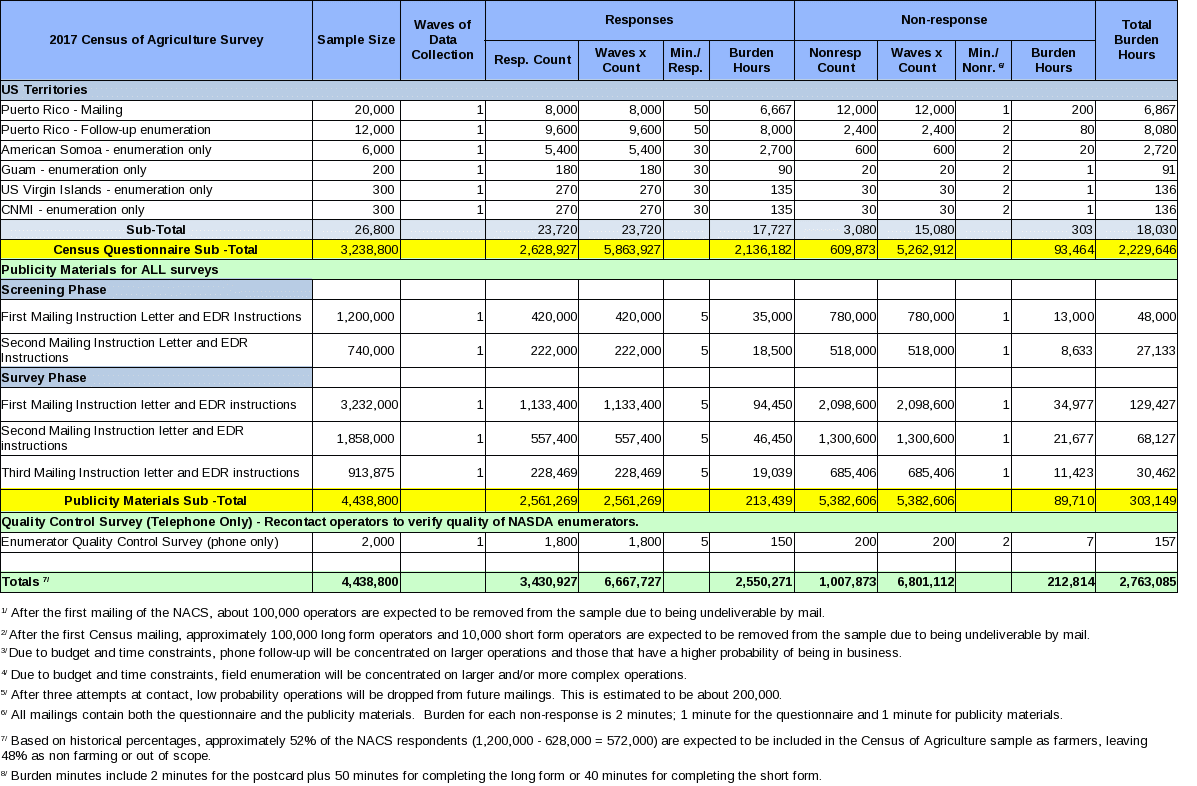 The table below shows estimates of the amount of time needed to complete the questionnaires based on results from the 2015 Census of Agriculture Content Test (OMB No. 0535-0243). The interview lengths were weighted by the 2012 percentages of farms by size group based on value of sales; value of sales ranges used were: less than $10,000; $10,000-49,999; and $50,000 plus. Estimates of the non-farm response are based on re-contacts completed for the 2012 Census of Agriculture and the 2015 Content Test.