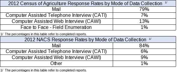 During the Census of Agriculture Content Test (OMB No. 0535-0243) participants were allowed to choose CAWI as a response mode. Instructions and an access code were included on the back of the cover letter that was sent to all potential participants in the first mailing. The instructions emphasized that online reporting is quick, convenient, and secure. About 2,800 participants (approximately 10 percent) used the internet version during the Content Test.