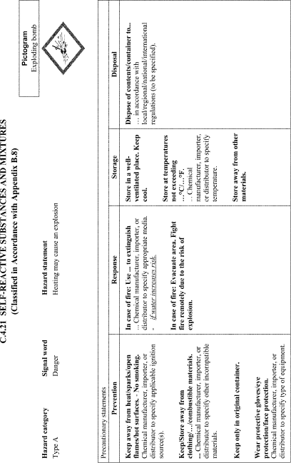 Note: Classification of solid chemicals shall be based on tests performed on the chemical as presented. If, for example, for the purposes of supply or transport, the same chemical is to be presented in a physical form different from that which was tested and which is considered likely to materially alter its performance in a classification test, classification must be based on testing of the chemical in the new form. B.8 SELF-REACTIVE CHEMICALS B.8.1 Definitions Self-reactive chemicals are thermally unstable liquid or solid chemicals liable to undergo a strongly exothermic decomposition even without participation of oxygen (air). This definition excludes chemicals classified under this section as explosives, organic peroxides, oxidizing liquids or oxidizing solids. A self-reactive chemical is regarded as possessing explosive properties when in laboratory testing the formulation is liable to detonate, to deflagrate rapidly or to show a violent effect when heated under confinement. B.8.2 Classification Criteria B.8.2.1 A self-reactive chemical shall be considered for classification in this class unless: (a) It is classified as an explosive according to B.1 of this appendix; (b) It is classified as an oxidizing liquid or an oxidizing solid according to B.13 or B.14 of this appendix, except that a mixture of oxidizing substances which contains 5% or more of combustible organic substances shall be classified as a self-reactive chemical according to the procedure defined in B.8.2.2; (c) It is classified as an organic peroxide according to B.15 of this appendix; (d) Its heat of decomposition is less than 300 J/g; or (e) Its self-accelerating decomposition temperature (SADT) is greater than 75 °C (167 °F) for a 50 kg (110 lb) package. B.8.2.2 Mixtures of oxidizing substances, meeting the criteria for classification as oxidizing liquids or oxidizing solids, which contain 5% or more of combustible organic substances and which do not meet the criteria mentioned in B.8.2.1 (a), (c), (d) or (e), shall be subjected to the self-reactive chemicals classification procedure in B.8.2.3. Such a mixture showing the properties of a self-reactive chemical type B to F shall be classified as a self-reactive chemical. B.8.2.3 Self-reactive chemicals shall be classified in one of the seven categories of “types A to G” for this class, according to the following principles: (a) Any self-reactive chemical which can detonate or deflagrate rapidly, as packaged, will be defined as self-reactive chemical TYPE A; (b) Any self-reactive chemical possessing explosive properties and which, as packaged, neither detonates nor deflagrates rapidly, but is liable to undergo a thermal explosion in that package will be defined as self-reactive chemical TYPE B; (c) Any self-reactive chemical possessing explosive properties when the chemical as packaged cannot detonate or deflagrate rapidly or undergo a thermal explosion will be defined as self-reactive chemical TYPE C; (d) Any self-reactive chemical which in laboratory testing meets the criteria in (d)(i), (ii), or (iii) will be defined as self-reactive chemical TYPE D: (i) Detonates partially, does not deflagrate rapidly and shows no violent effect when heated under confinement; or (ii) Does not detonate at all, deflagrates slowly and shows no violent effect when heated under confinement; or (iii) Does not detonate or deflagrate at all and shows a medium effect when heated under confinement; (e) Any self-reactive chemical which, in laboratory testing, neither detonates nor deflagrates at all and shows low or no effect when heated under confinement will be defined as self-reactive chemical TYPE E; (f) Any self-reactive chemical which, in laboratory testing, neither detonates in the cavitated state nor deflagrates at all and shows only a low or no effect when heated under confinement as well as low or no explosive power will be defined as self-reactive chemical TYPE F; (g) Any self-reactive chemical which, in laboratory testing, neither detonates in the cavitated state nor deflagrates at all and shows no effect when heated under confinement nor any explosive power, provided that it is thermally stable (self-accelerating decomposition temperature is 60 °C (140 °F) to 75 °C (167 °F) for a 50 kg (110 lb) package), and, for liquid mixtures, a diluent having a boiling point greater than or equal to 150 °C (302 °F) is used for desensitization will be defined as self-reactive chemical TYPE G. If the mixture is not thermally stable or a diluent having a boiling point less than 150 °C (302 °F) is used for desensitization, the mixture shall be defined as self-reactive chemical TYPE F. B.8.3 Additional Classification Considerations B.8.3.1 For purposes of classification, the properties of self-reactive chemicals shall be determined in accordance with test series A to H as described in Part II of the UN ST/SG/AC.10 (incorporated by reference; See §1910.6). B.8.3.2 Self-accelerating decomposition temperature (SADT) shall be determined in accordance with the UN ST/SG/AC.10, Part II, section 28 (incorporated by reference; See §1910.6). B.8.3.3 The classification procedures for self-reactive substances and mixtures need not be applied if: (a) There are no chemical groups present in the molecule associated with explosive or self-reactive properties; examples of such groups are given in Tables A6.1 and A6.2 in the Appendix 6 of the UN ST/SG/AC.10 (incorporated by reference; See §1910.6); or (b) For a single organic substance or a homogeneous mixture of organic substances, the estimated SADT is greater than 75 °C (167 °F) or the exothermic decomposition energy is less than 300 J/g. The onset temperature and decomposition energy may be estimated using a suitable calorimetric technique (See 20.3.3.3 in Part II of the UN ST/SG/AC.10 (incorporated by reference; See §1910.6)). B.9 PYROPHORIC LIQUIDS B.9.1 Definition Pyrophoric liquid means a liquid which, even in small quantities, is liab