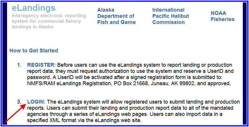 Note on the eLandings homepage section titled, How to Get Started and below this title, Web eLandings selection # 2. Login to make a landing report:.