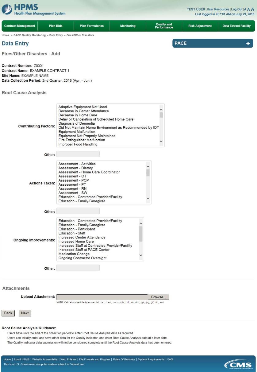 On the Data Entry – Root Cause Analysis page (Figure III-77), enter data, and upload attachments as needed. Click Browse to locate the file(s) to upload, and click Next.