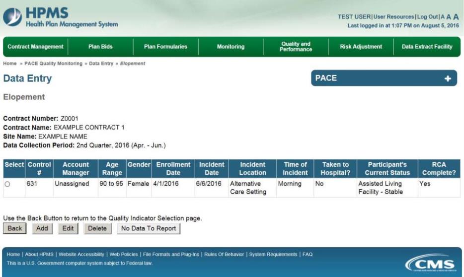 On the Data Entry – Elopement page (Figure III-70), click Add to add an incident record. The Edit and Delete buttons will be disabled if there are no records to edit or delete. (See the PACE Quality Indicator: No Data to Report section above to report no data for the collection period.)