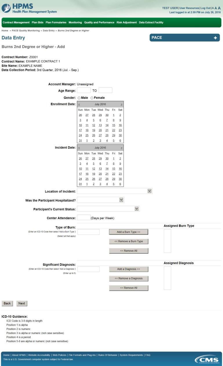 On the Data Entry – Burns 2nd Degree or Higher – Add page (Figure III-61), enter data, and click Next.