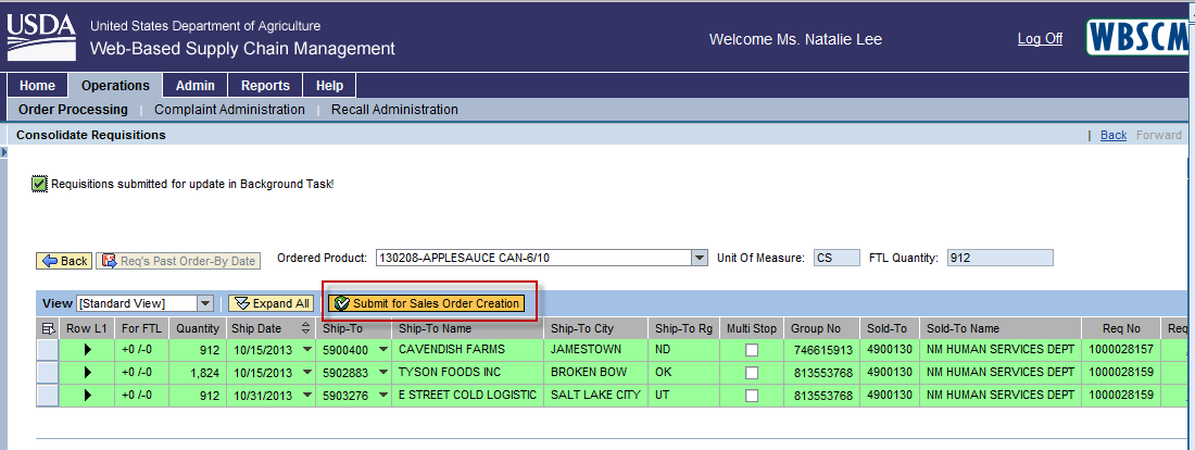 *By clicking the “Submit for Sales Order Creation” button, the requisition orders are submitted for Sales Order creation and are routed to FNS for approval.