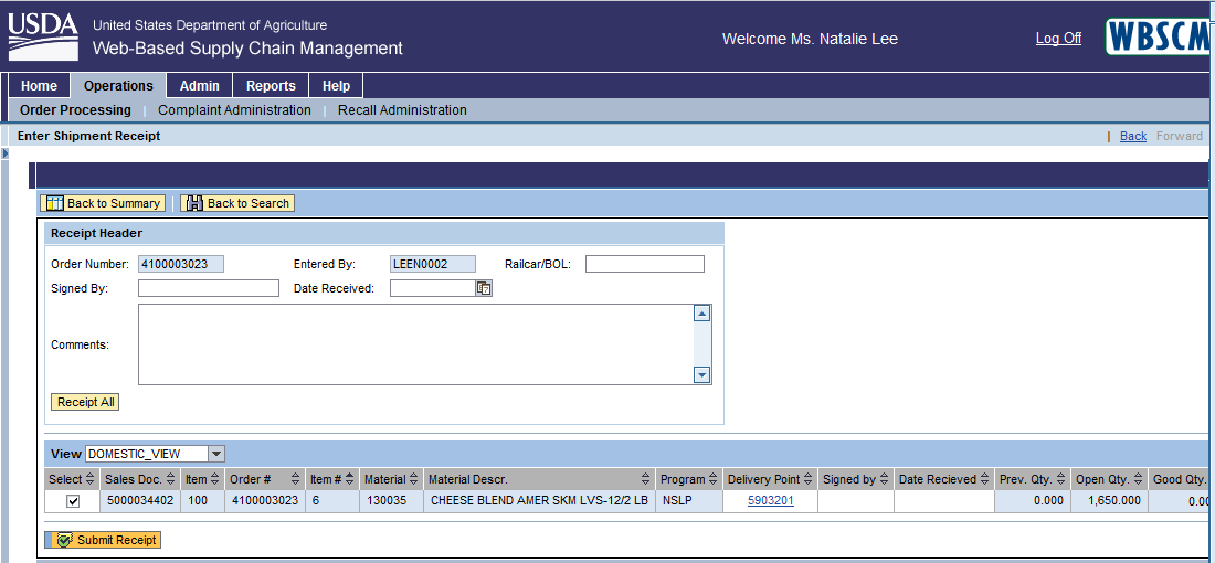 Screenshot #1: Shipment Receipt Form
