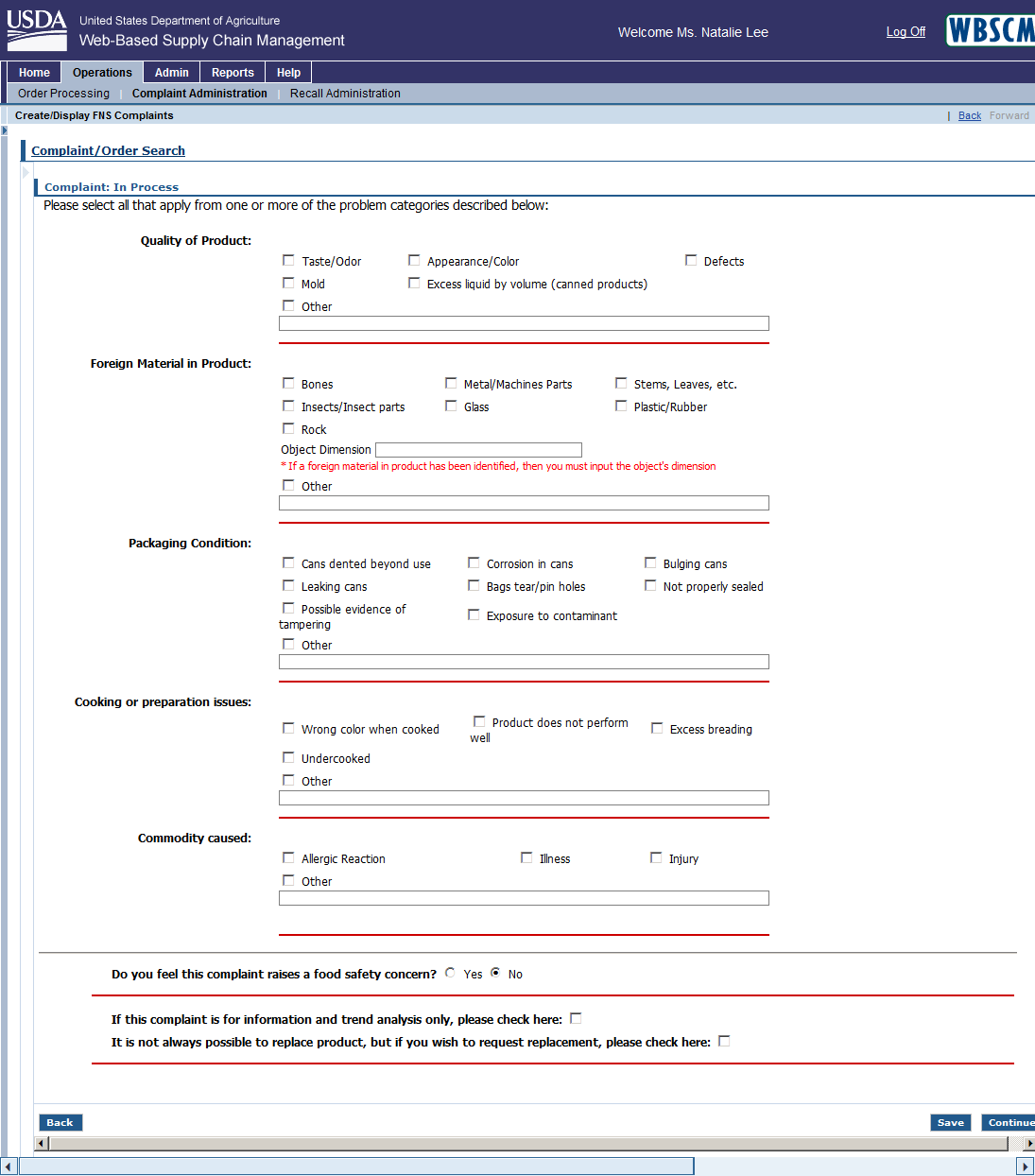 Screenshot #3: WBSCM Complaints Form (Food Safety Info Form)