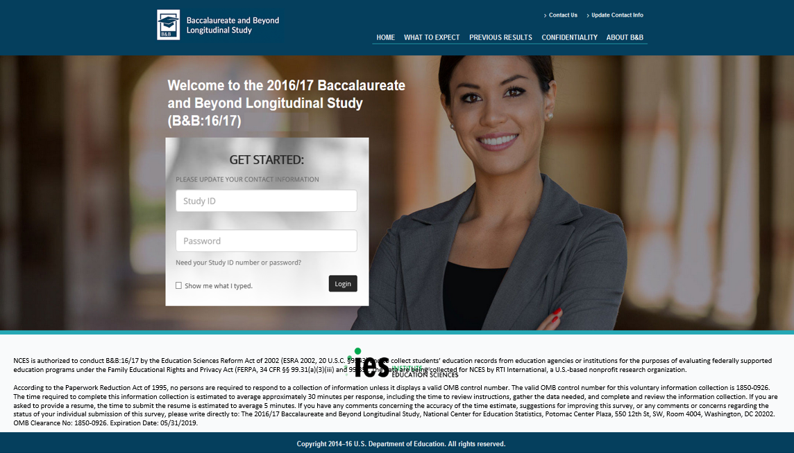 In addition to the survey facsimile for the B&B:16/17 main study, including the abbreviated survey and eligibility screener with address update items, this appendix provides mock ups of the screens included in the confidentiality pledge experiment, as detailed in Part B, that will be used for the B&B:16/17 screener and survey. The experiment presents sample members with one of three versions of the Confidentiality Pledge language which is typically presented with the Paperwork Reduction Act (PRA) statement and the study authorization citation at the start of data collection instruments: (1) citing the legislation only; (2) stating that Homeland Security would be monitoring electronic data transmissions required for the data collection; or (3) that federal employees and contractors would perform the monitoring. In addition, the experiment will determine whether the placement of the confidentiality pledge (A) on the first screen encountered in the instrument, which is either the main login screen or the landing page reached through an emailed link (Login Screen Group), where the pledge is provided together with the Paperwork Reduction Act (PRA) statement and the study authorization citation, or (B) on a second screen with the pledge wording presented by itself (Separate Pledge Screen) has an effect on sample members’ willingness to initially choose to participate in (participation rate) and ultimately continue through and complete (response rate) each – the screener and the survey.