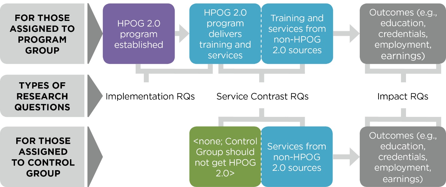 In contrast, those randomly assigned to the control group (the bottom row of the exhibit) are not offered access to the HPOG 2.0 program, but may obtain training and other support services from other sources. The same set of outcomes emerges, though possibly at different levels: education and credentials, employment and earnings, public assistance, and overall well-being.
