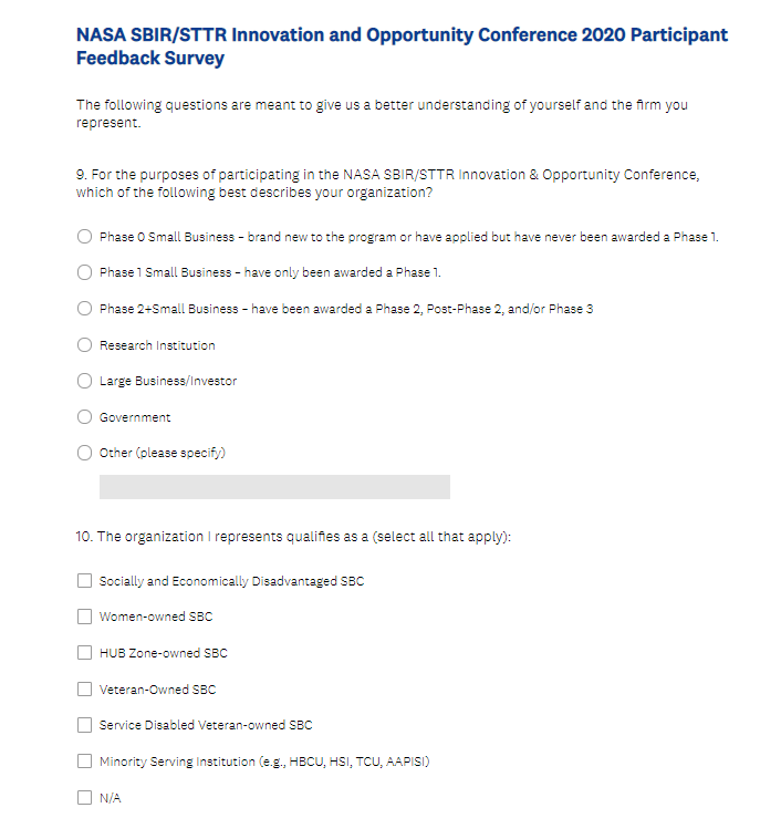NASA SBIR/STTR Innovation and Opportunity Conference 2020 Participant Feedback Survey