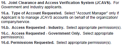 Description of changes in new DD-2962 version: The present version of DD-2962 remains unchanged; this version allows authorized users to request access to the Joint Personnel Adjudication System (JPAS). The proposed DD-2962 Version 2 replaces JPAS with DISS, in blocks 16 and 17 for user provisioning (see Figure 1), and in the associated instructions sections on page 3 (see Figure 2).