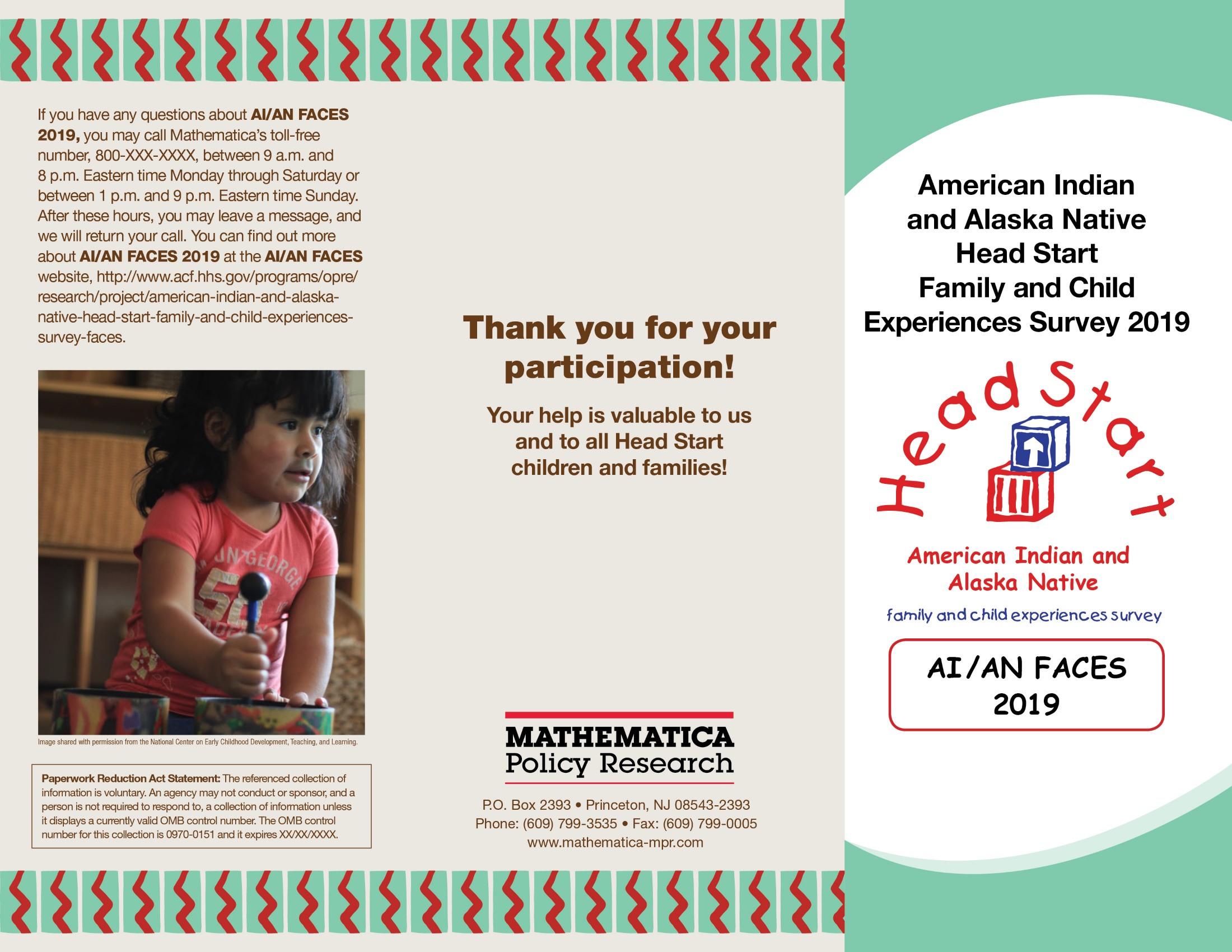 Thank you for taking part in the American Indian and Alaska Native Head Start Family and Child Experiences Survey 2019, known as AI/AN FACES 2019. As a reminder, the purpose of AI/AN FACES 2019 is to provide details about the characteristics, experiences, and outcomes of children and families whom Region XI AI/AN Head Start programs serve. The information collected will help Head Start improve its services to children and families in AI/AN Head Start programs. It is funded by the Administration for Children and Families, U.S. Department of Health and Human Services. Mathematica Policy Research, an independent research firm, is conducting the study.