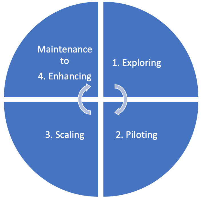 Is the project’s development complete and now in a maintenance mode? Has ongoing evaluation been established? Is there high adoption and retention by users? And finally, if a project has been in maintenance mode but now, due to changes (e.g., within domains or target user communities, new partners or implementers, similar solutions offered by others), is there possible value to enhancing the existing project’s results? Are capacity and resources available, as well as some evidence of anticipated benefit, to restart a project’s work possibly pushing towards a new exploratory mode?