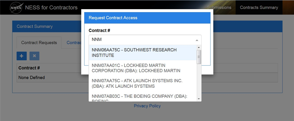 Perform this procedure to obtain access to contracts or view contract information in NESS for Contractors.