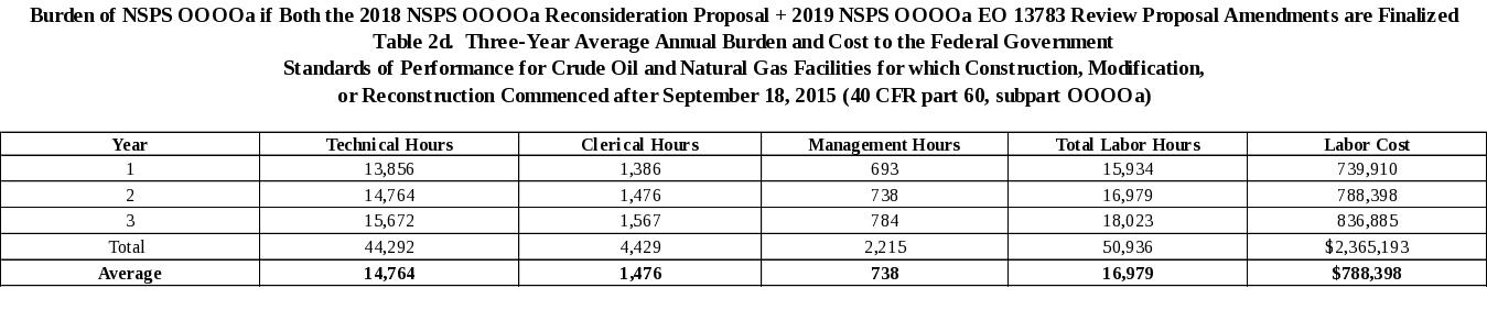 This ICR estimates the information collection burden for NSPS OOOOa considering the proposed amendments in 2019 NSPS OOOOa EO 13783 Review Proposal. The estimates presented in the body of this document reflect the impacts of NSPS OOOOa assuming a combination of the amendments contained in the 2018 NSPS OOOOa Reconsideration Proposal and the amendments in the 2019 NSPS OOOOa EO 13783 Review Proposal.b,c In addition, the burden is estimated without consideration of the 2018 proposed amendments and presented in an Appendix.