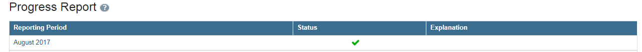 Note: For some requirements, like the sustainability plan, the system makes assumptions. In this case, if a coalition is in Year 3 or Year 7 and did not submit a sustainability plan with their progress report, the Report Card will show a red X. However, if a coalition is not in either of those years, a gray bar will appear under “Status” next to the required year, indicating that this requirement is “not applicable” for the coalition.