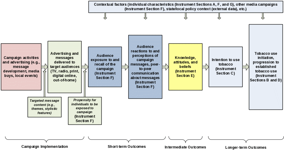 Measurable population-level behavior change—such as a change in youth smoking prevalence—is the product of a series of changes in interrelated, individual-level beliefs, attitudes and perceptions about norms, and environmental-level factors such as smoke-free laws (Ajzen & Fishbein, 1980; Bandura, 1985; Hornik, 2002; Rosenstock, Strecher, & Becker, 1988; Trickett et al., 2011). Behavior change theory guides our understanding of how campaigns function (Ajzen, 1991; Bandura, 1985; Rosenstock et al., 1988; Trickett et al., 2011) and defines our expectations about the order in which campaign effects should occur: belief change, attitude and social norm change, intention, and finally behavior change (Fishbein, 1967). The Centers for Disease Control and Prevention’s (CDC’s) Best Practices for Comprehensive Tobacco Control Programs quantifies the timeline for these expectations, indicating that campaigns that deliver a sufficient amount of media will produce campaign awareness at 6 months, attitude change at 12 to 18 months, and behavior change at 18 to 24 months (CDC, 2007). A National Cancer Institute (NCI) study similarly concludes that campaigns “influence attitudes toward tobacco within a short period, followed by longer-term effects on smoking behavior” (NCI, 2008, p. 534). In practice, changes in beliefs, attitudes, and intention are often the first indicators of campaign effectiveness and, as a result, are among the first outcomes examined in the course of campaign evaluation (Cowell et al., 2009; Farrelly et al., 2005; Murray, Prokhorov, & Harty, 1994; Murukutla et al., 2012; Vallone et al., 2011a, b).